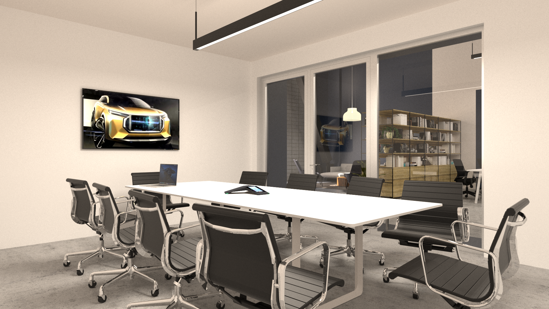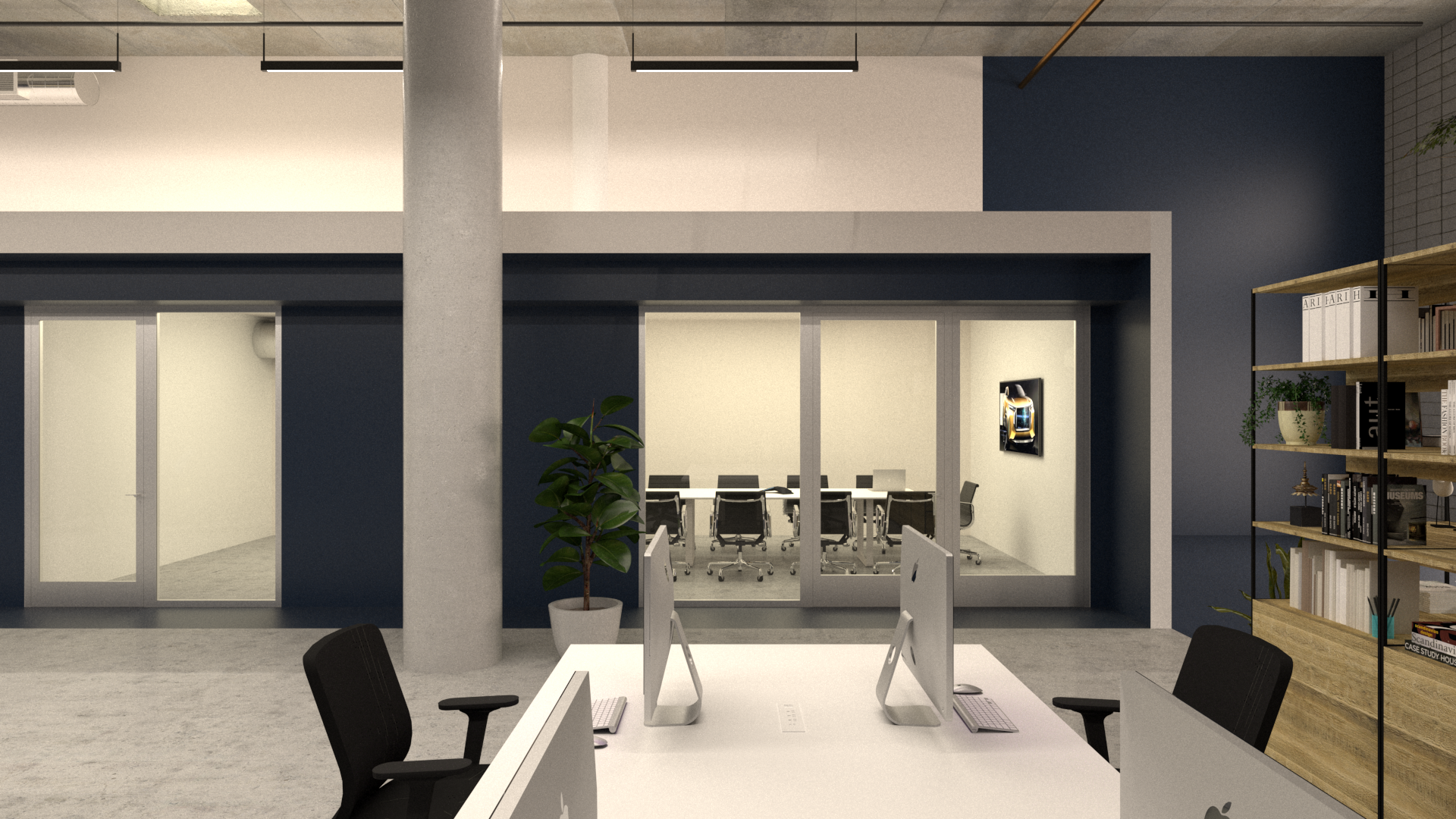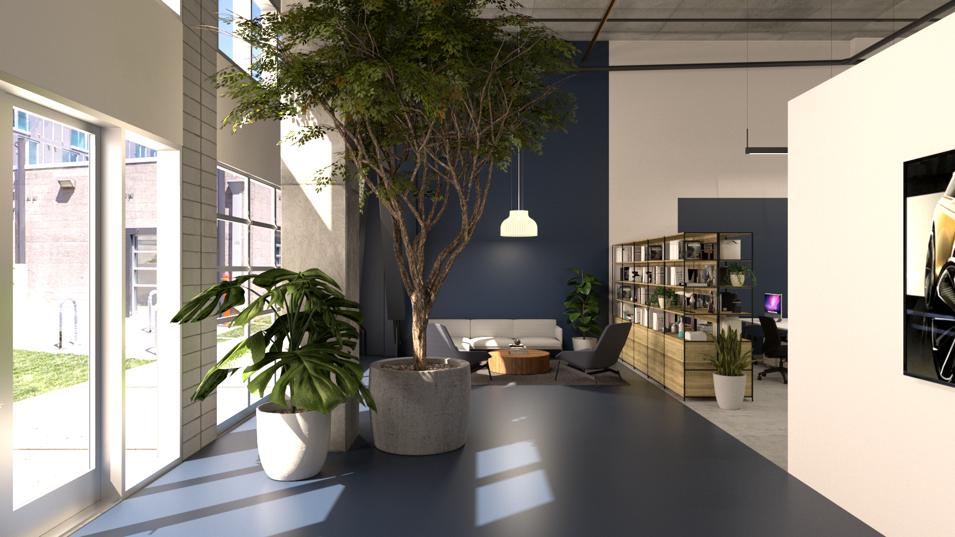 I was asked by my client to design and render an automotive design studio in an existing building that reflects the brand’s ethos of sustainable mobility and luxury. Programmatically, the space required sufficient room to park and move a full-size vehicle without interrupting the workspace. A dense shelving unit separates the designers from the meeting lounge, while retaining openness and continuity of the studio.