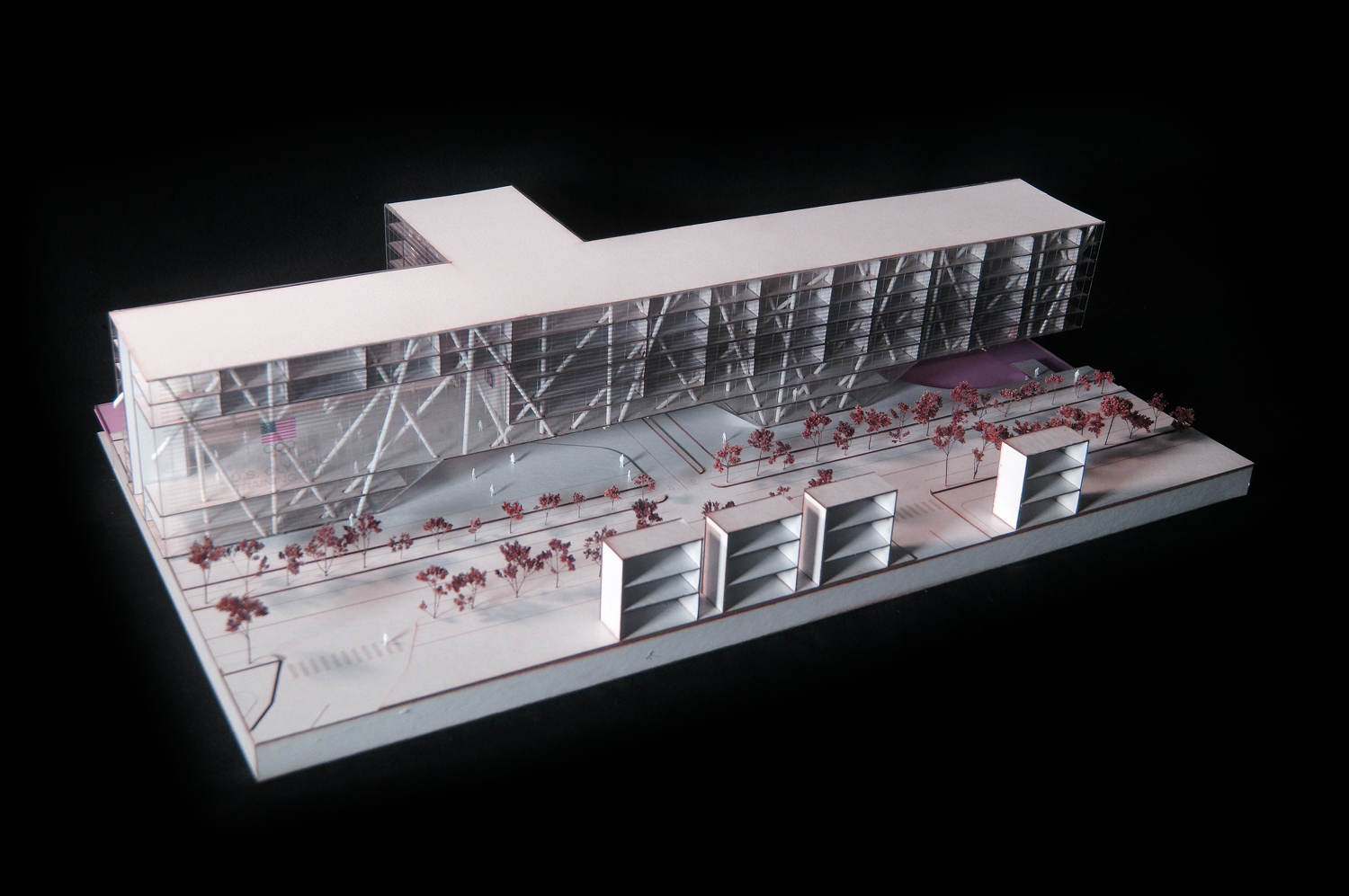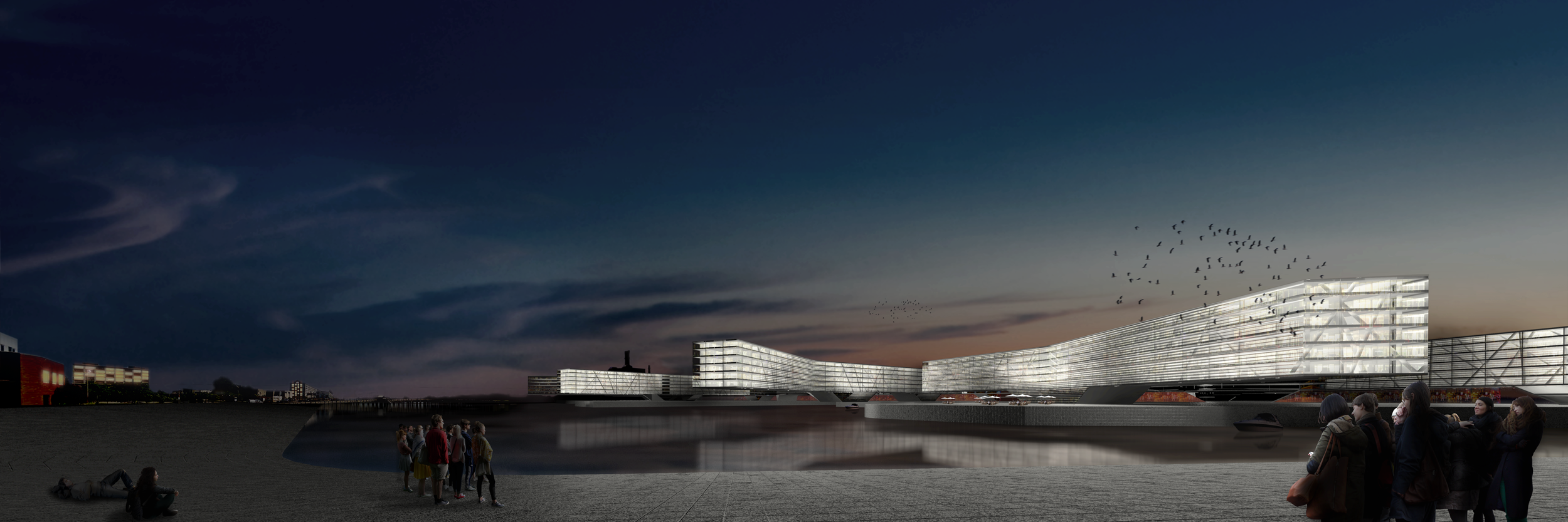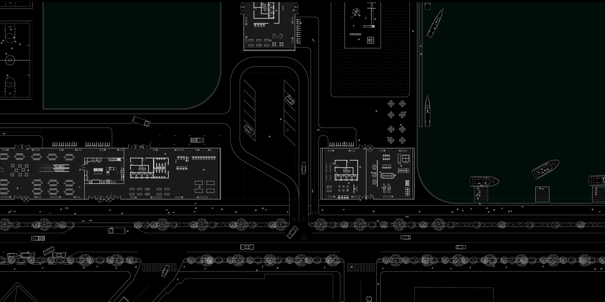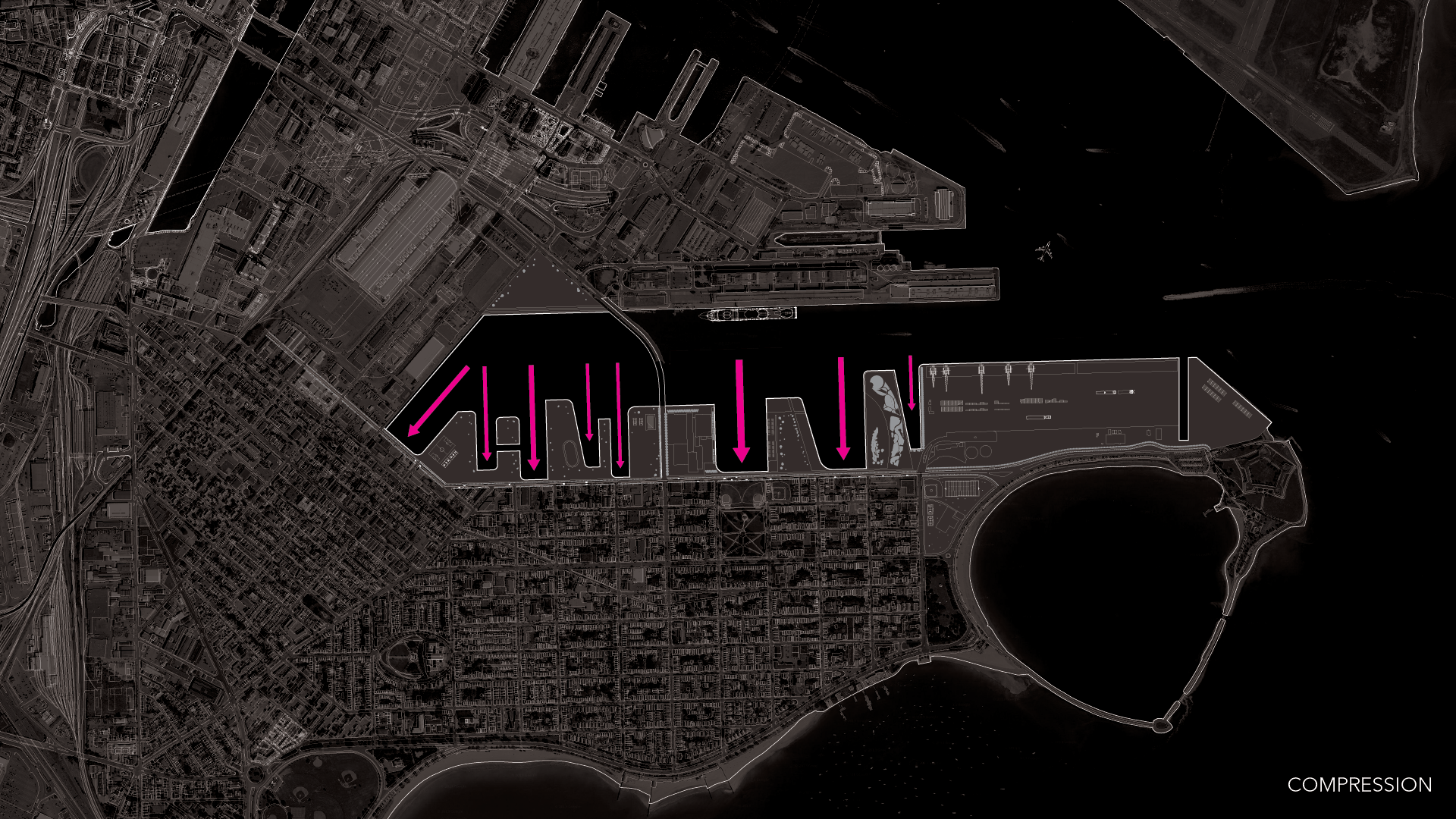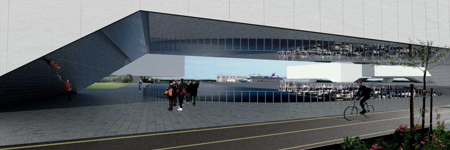 This urban scheme bases its formal gestures on Boston’s existing conditions. Privatized wharfs cover much of Boston Inner Harbor’s waterfront, maximizing its shoreline for commercial development. These wharfs are often occupied by mid-rise towers, which consequently make the harbor virtually invisible to the street and devoid of communal spaces. By replacing such buildings with sports facilities, open-air amphitheaters, and food markets, the water’s edge can be maximized for public recreation, while maintaining the language of the piers. Initially, these piers built along 1st Street are to be occupied by athletes during the speculative Boston Olympics. A mixed use building lifted two floors above grade traces the north side of the road, creating a threshold from the esplanade into the site. From this large structure, a series of elevated residential buildings branch off towards and into the waterfront, further subdividing the piers into more intimate regions for recreation.