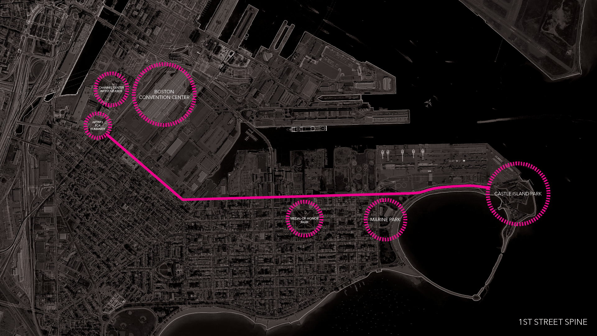 In South Boston, 1st Street bifurcates the district into an industrial zone and a residential neighborhood. However, recently developed public art institutions and studio spaces anchor the west end, along with a series of parks which line the street and ultimately lead to one of Boston’s key destinations, Pleasure Bay. This creates an opportunity to develop the street into an esplanade alongside the reserve channel.